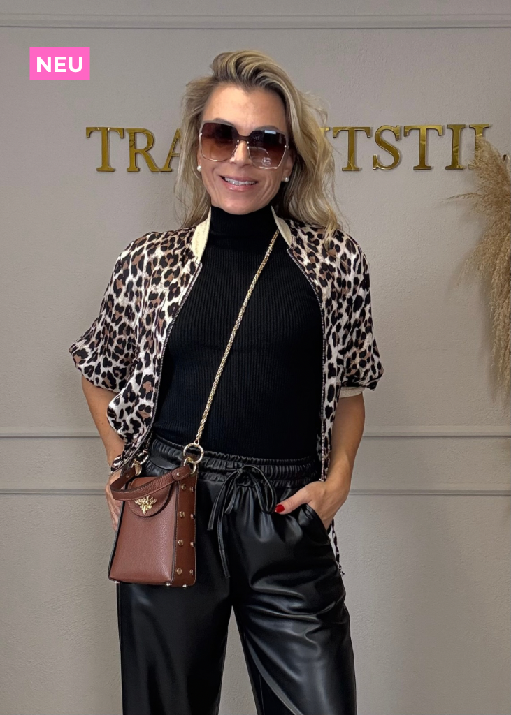 Entdecke deinen neuen Lieblingslook mit unserem Blouson im Leo-Print! Das ultra leichte Material sorgt für ein angenehmes Tragegefühl, perfekt für warme Tage. Die Bündchen an Ärmel und Kragen mit einem zarten Schimmer verleihen dir einen eleganten Touch, während du den Bund unten nach Belieben raffen kannst, um den Look individuell anzupassen. Gönn dir dieses stylische Piece und fühl dich einfach wohl und selbstbewusst!