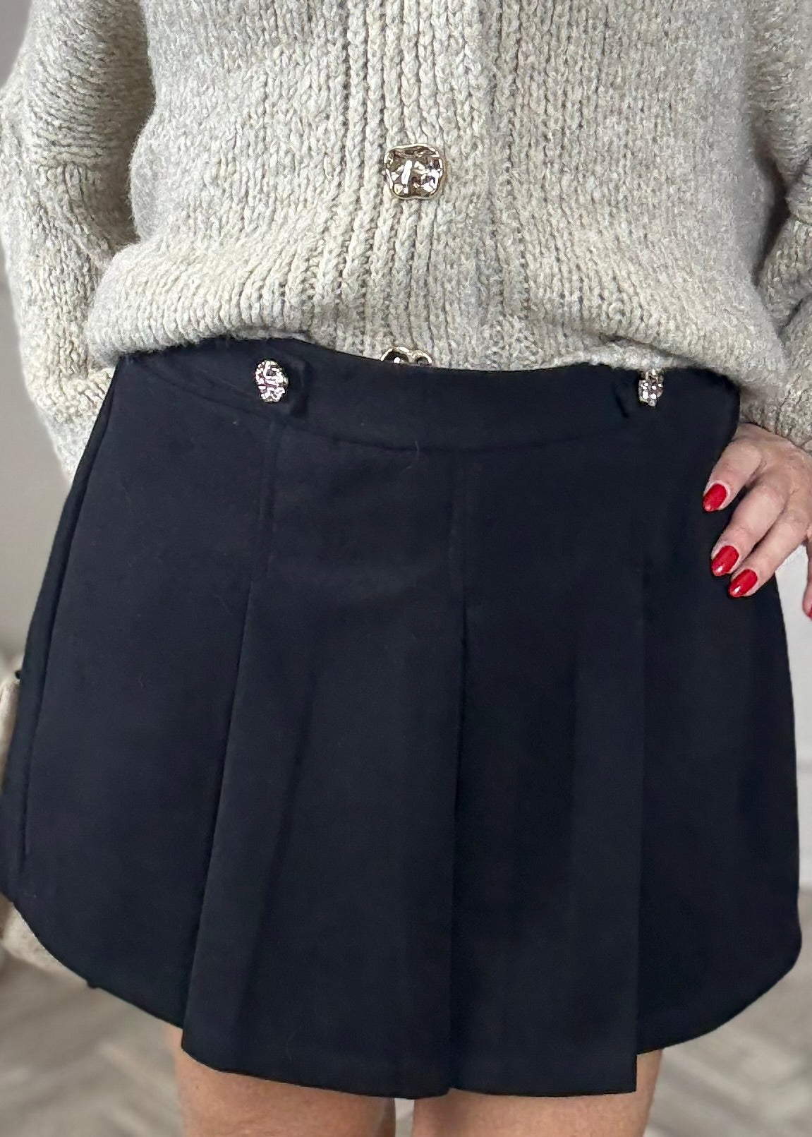 Ein echtes Fashion-Statement: Dieser elegante Hosenrock vereint den Tragekomfort einer Hose mit dem femininen Look eines Rocks. Vorne wie ein Rock geschnitten, mit edlen silbernen Dekoknöpfen und stilvoll gelegten Falten, entsteht ein fließender, moderner Look. Hinten als Hose gearbeitet, sorgt der Schnitt für maximale Bewegungsfreiheit.