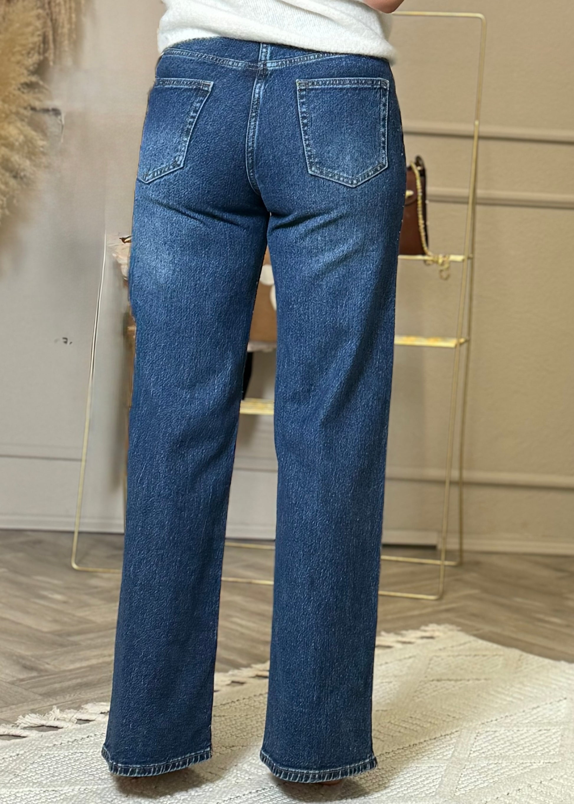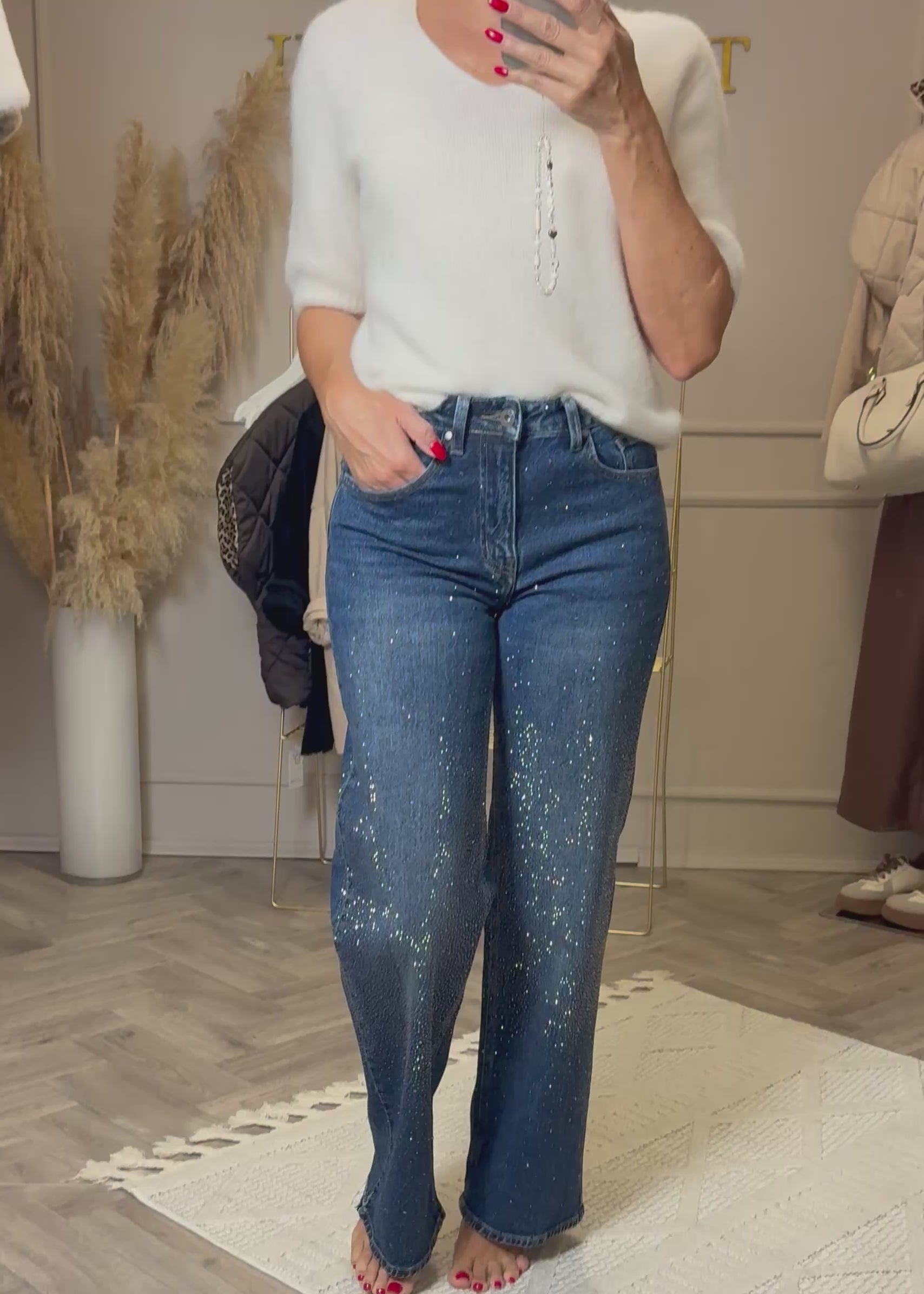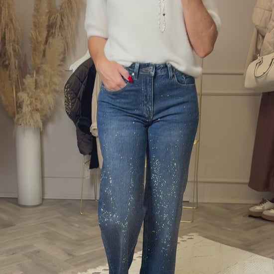 Diese Jeans ist ein echtes Highlight! Im vorderen Bereich aufwendig mit funkelnden Steinchen besetzt, verleiht sie jedem Outfit eine Extraportion Glamour. Der weite gerade Schnitt sorgt für eine schmeichelhafte Silhouette, während das hochwertige Denim-Material angenehmen Tragekomfort bietet. Ob casual mit Sneakern oder elegant mit Heels kombiniert – diese Jeans zieht alle Blicke auf sich und macht jeden Look zu etwas Besonderem.