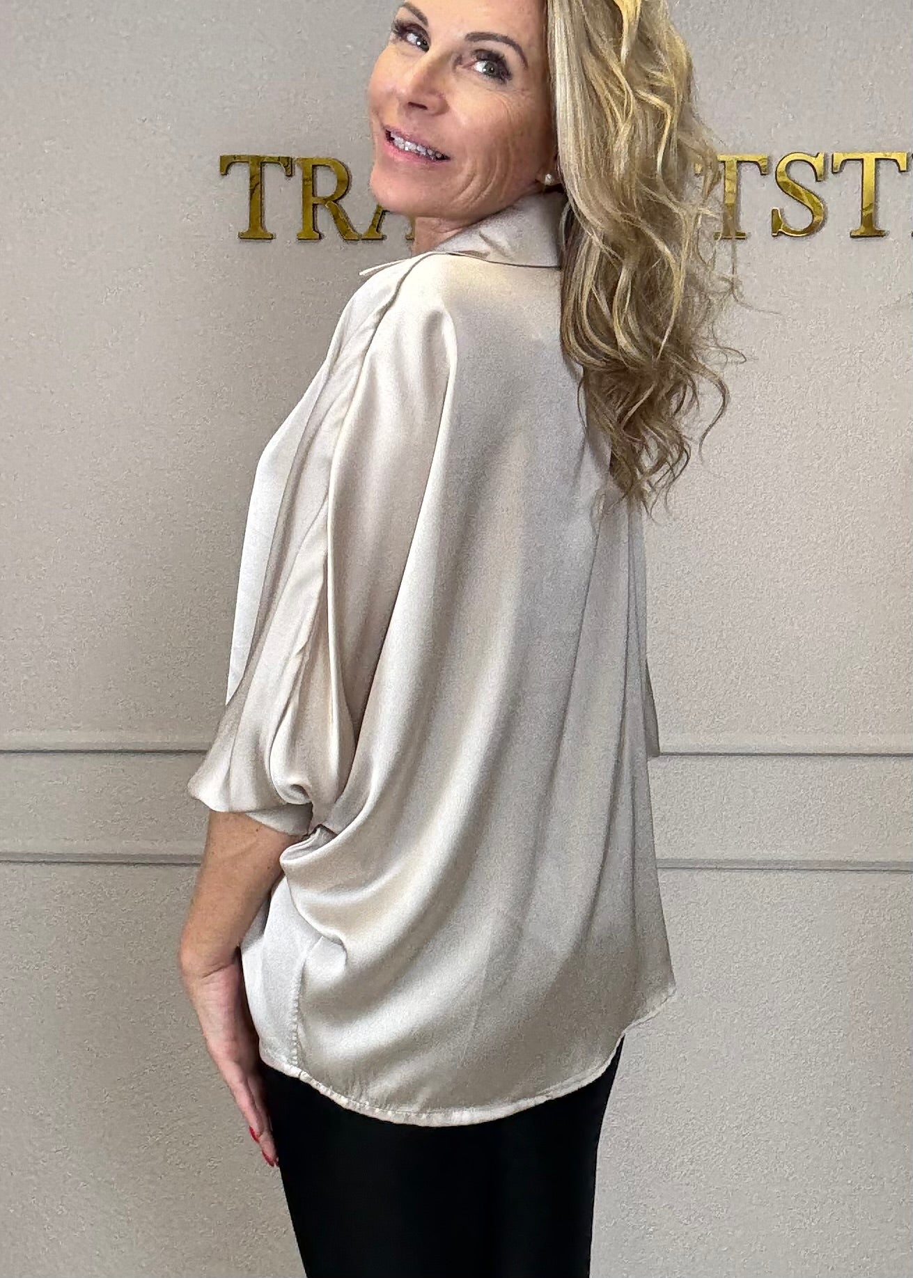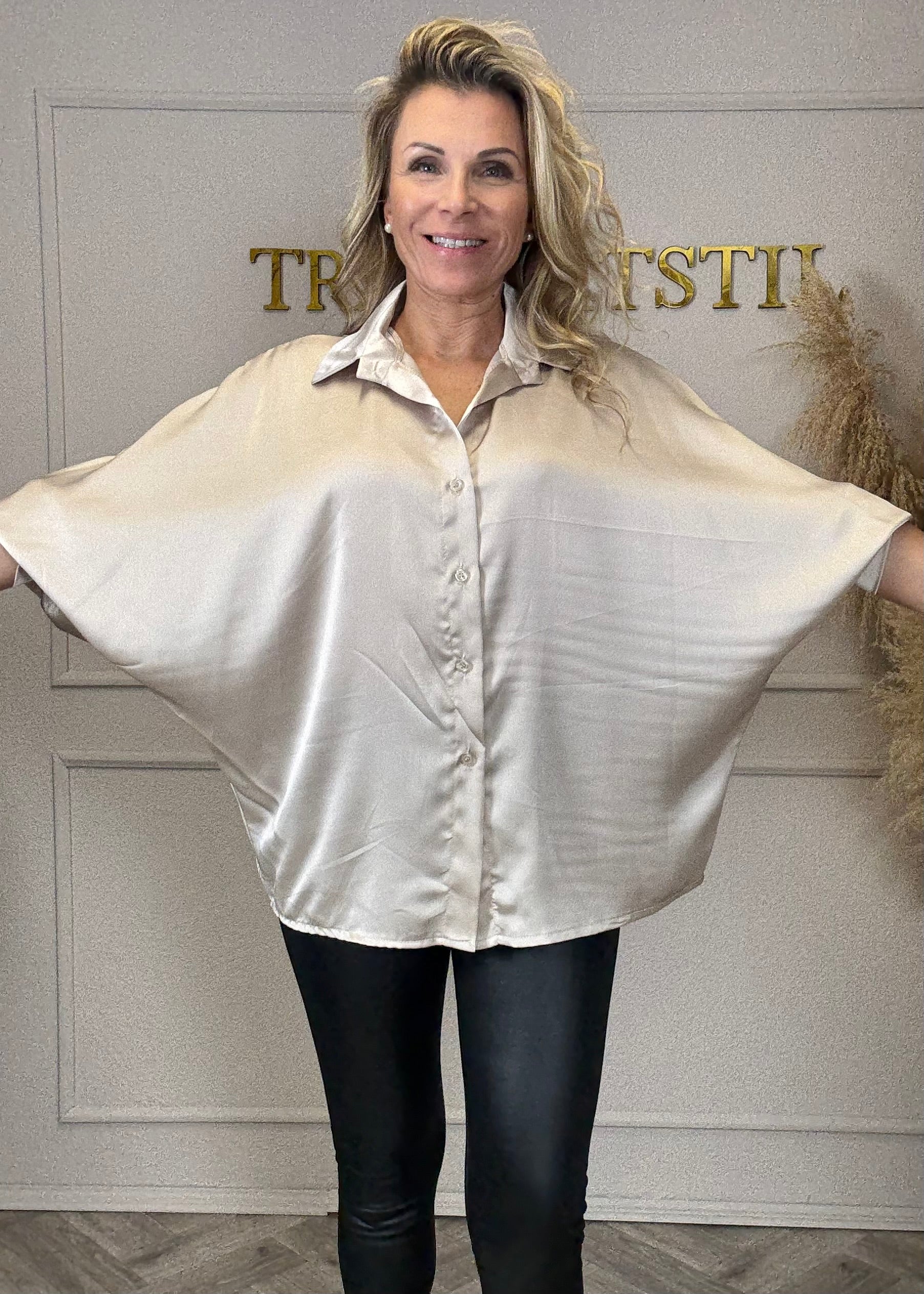 Diese Bluse überzeugt durch ihren außergewöhnlichen Fledermaus-Schnitt, der nicht nur für eine lockere Passform sorgt, sondern auch jedem Look eine moderne, stylische Note verleiht. Die weit geschnittenen Ärmel fließen sanft in den Körper der Bluse über und sorgen für ein angenehmes Tragegefühl und maximale Bewegungsfreiheit.