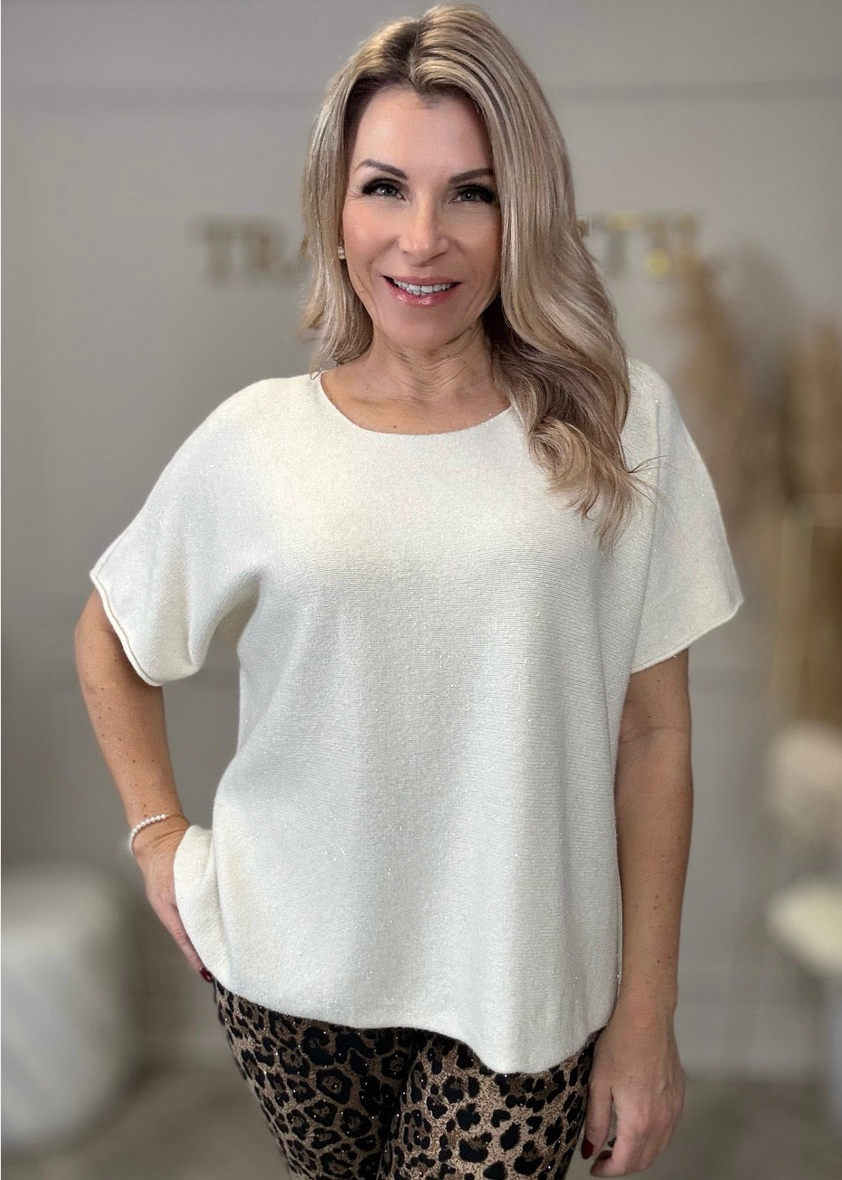 Wunderschöner kurzarm Strickpulli mit dezentem Glitzergarn. Ideal für den kommenden Frühling.