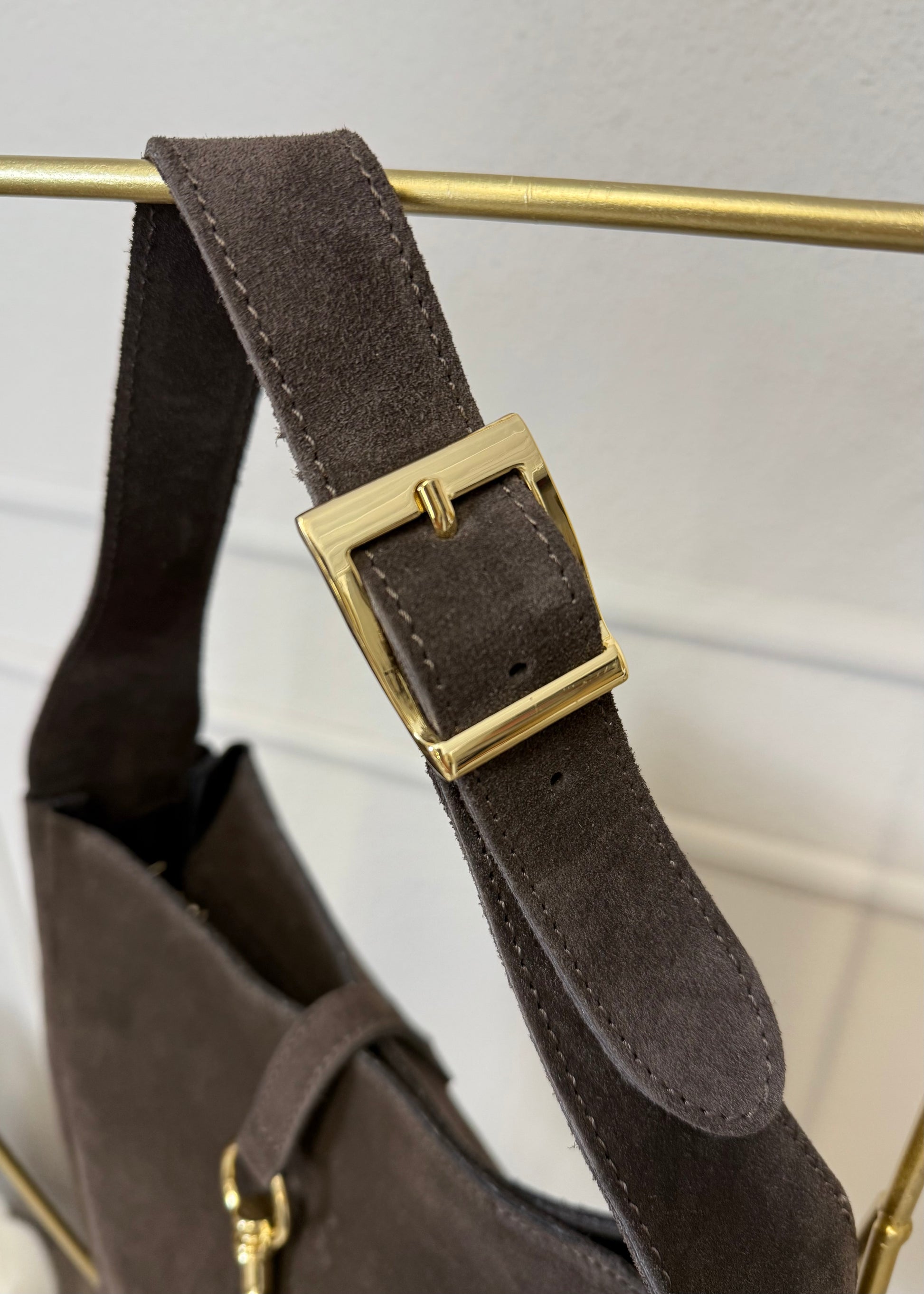 Diese stilvolle Umhängetasche aus echtem Wildleder vereint lässigen Chic mit eleganten Akzenten. Das hochwertige, weiche Material in warmem Braunton wird durch goldene Hardware-Details perfekt ergänzt und sorgt für einen luxuriösen Look.