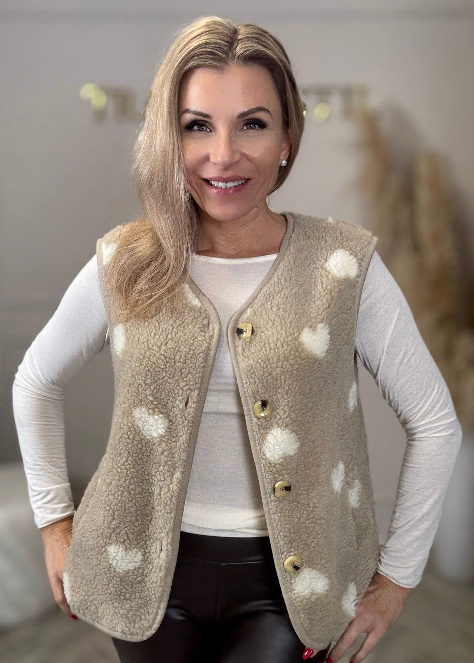Diese flauschige Teddyweste mit süßem Herz-Design ist der perfekte Begleiter für kühle Herbsttage. Das weiche Teddyfell sorgt für wohlige Wärme und verleiht jedem Outfit einen charmanten, verspielten Look. Ideal für angesagte Layer-Looks – ob über Pullover, Kleid oder Hoodie getragen.